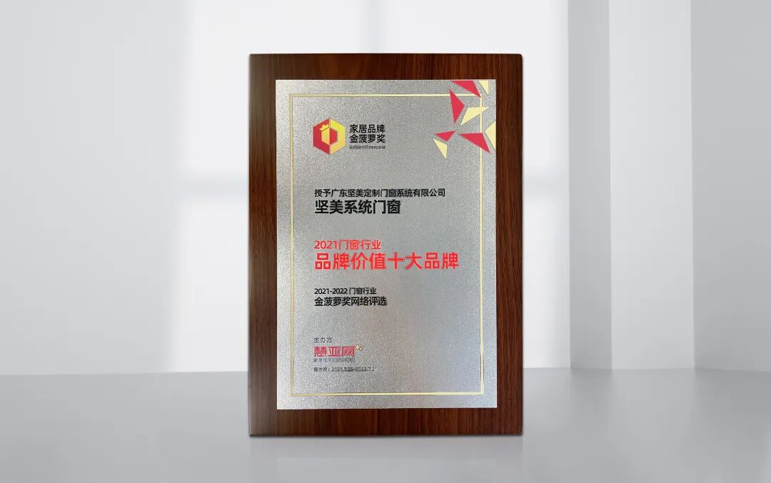 在本次行业盛会中,坚美定制门窗系统凭借扎实的产品品质,在2021-2022门窗行业金菠萝奖网络评选中,在一众参选品牌中脱颖而出,荣膺“2021门窗品牌价值十大品牌”。